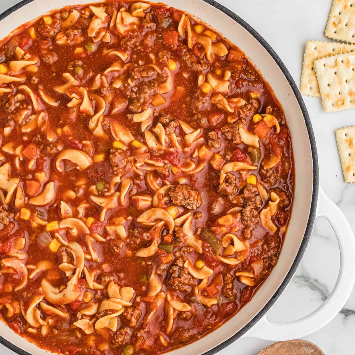 This hearty hamburger soup is packed with ground beef, tender egg noodles, and plenty of vegetables. Instructions are included to make it on the slow cooker or on the stovetop. Either way, it’s classic beef and noodles comfort food the whole family will love.